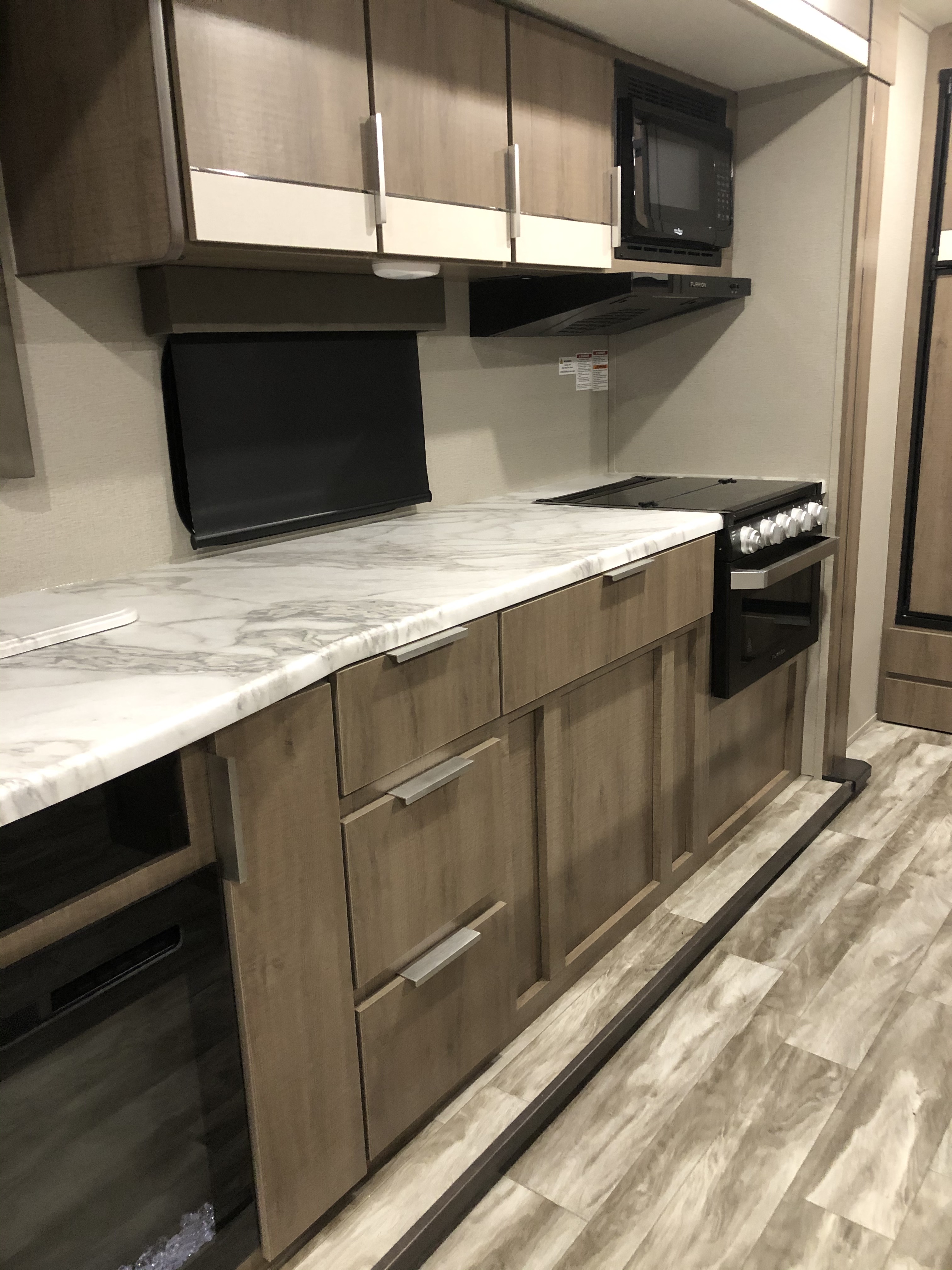 My husband, Gary, spent countless hours researching different manufacturers, designs and options. After all this he came to the conclusion that Grand Design was the right maker for us and the Imagine line would fit our lifestyle. Until we started looking seriously I had no idea there could be so many different sizes, plans and layouts for an RV. There are fifth wheels, travel trailers and toy haulers and then you can choose between basic, lightweight and luxury models. We were able to narrow our selection down somewhat based on what our truck could tow with models weighing between 5,500 to 8,500 pounds and varying in length from 26 to 36 feet. After all was said and done we purchased the Grand Design Imagine 2670MK which sleeps 4, features 2 slide outs, tv, and so many other wonderful options. Did I mention the heated recliners, fireplace, integrated dog bowls and kitchen island?? And contrary to my first impressions about RVs not having much storage space this one has more than we can fill!